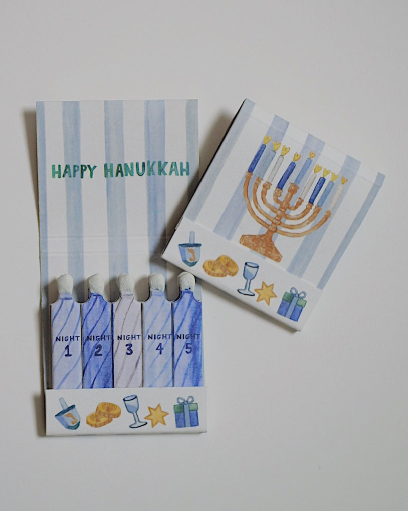 This modern Hanukkah matchbook is filled with tiny, meaningful details. The hand-painted cover features a beautiful menorah with heart-shaped flames and sweet holiday symbols such as a dreidel, gelt, a wine glass, and more.