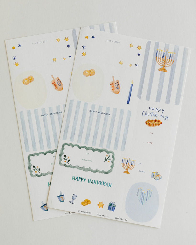 Add a little light and joy to your wrapping with our hand-illustrated Hanukkah Gift Label Sheets. Just fill in the To/From and pop them on your packages. From golden menorahs to dreidels, challah, gelt and soft blue stripes, each label brings a warm, festive touch to your holiday gifting.