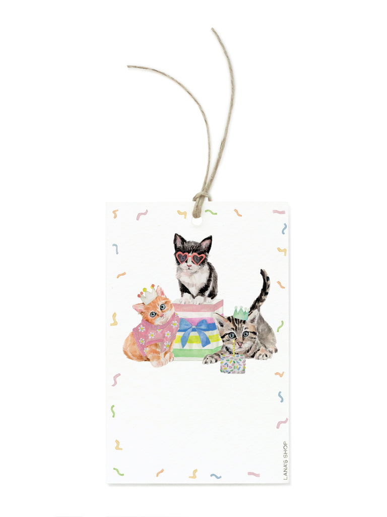 This hand-illustrated gift tag, features sweet kittens dressed up for a Birthday party. These cuties provide the perfect finishing touch to a beautiful present and offers a pretty place to express your happiest wishes. Great for cat lovers!